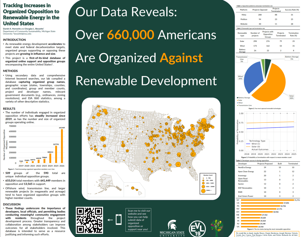 Danny presented his work, Tracking Increases in Organized Opposition to Renewable Energy in the United States, aided by Lab members Paul Borgess, Joey Conroy, Calvin Hyde, Parker Richards, and Tyler Swanson, at MSU’s UURAF and won 1st place in the General Social Science category. Awesome work, Danny!!!